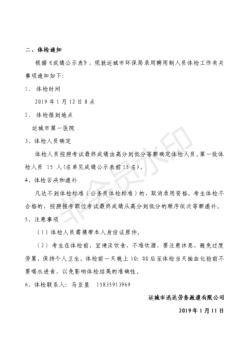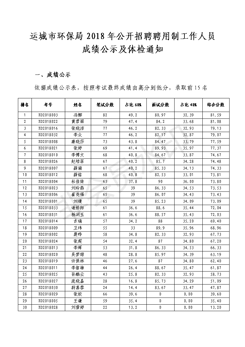 【公告】运城市环保局2018年公开招聘聘用制工作人员成绩公示及体检通知