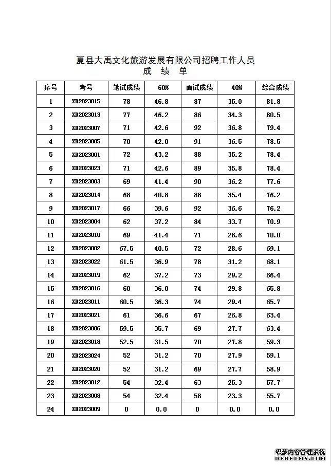 一、夏县大禹文化旅游发展有限公司考试已如期进行,现成绩公示如下: