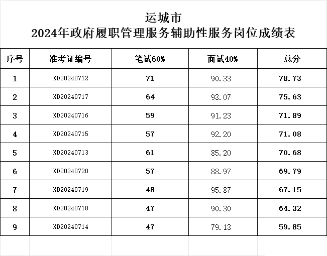 运城市2024年政府履职管理服务辅助性服务岗位考试已如期进行,现成绩公示如下: