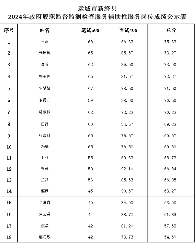 运城市2024年政府履职监督监测检查辅助性服务岗位考试已如期进行,现成绩公示如下: